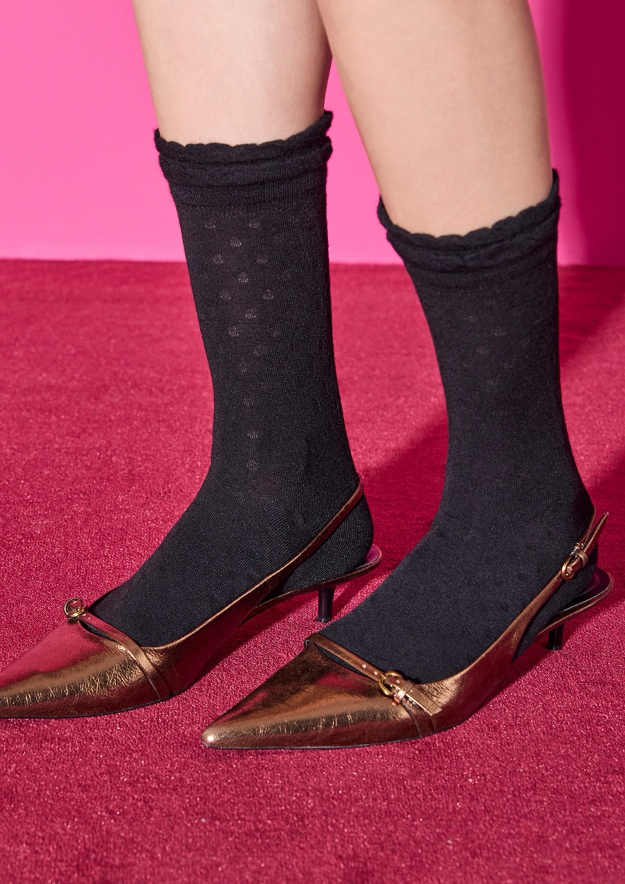 Calzino moda con modal e cashmere, con motivo di pois. Bordo comfort con doppia ruche. Punta e talloni anatomici.
