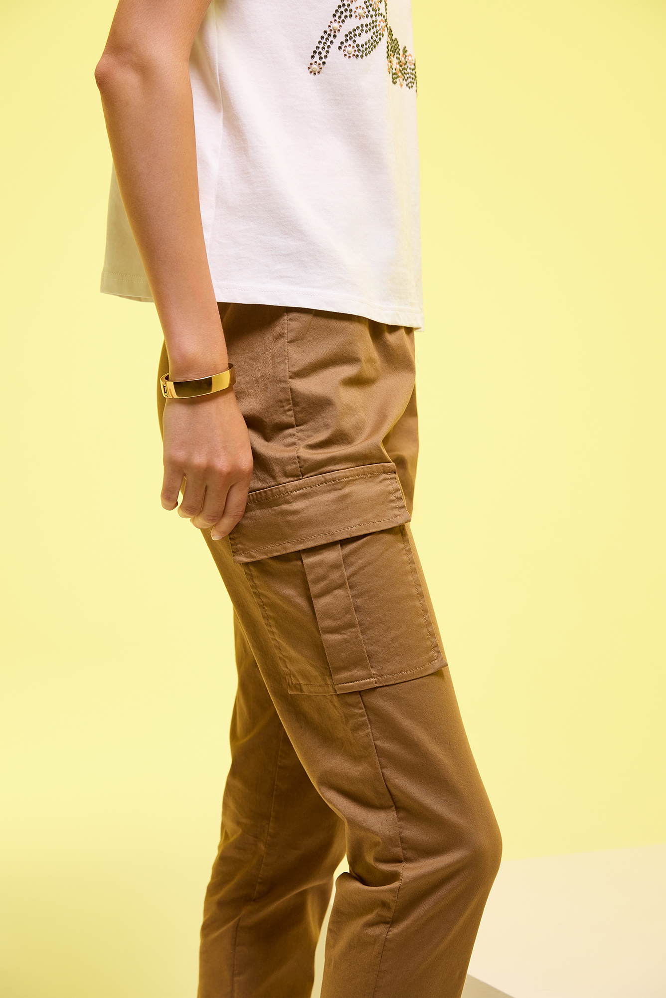 Leggings moda modello cargo con cotone leggero. Senza zip. Cinturino elasticizzato con passanti. Polso sul fondo gamba arricciato.