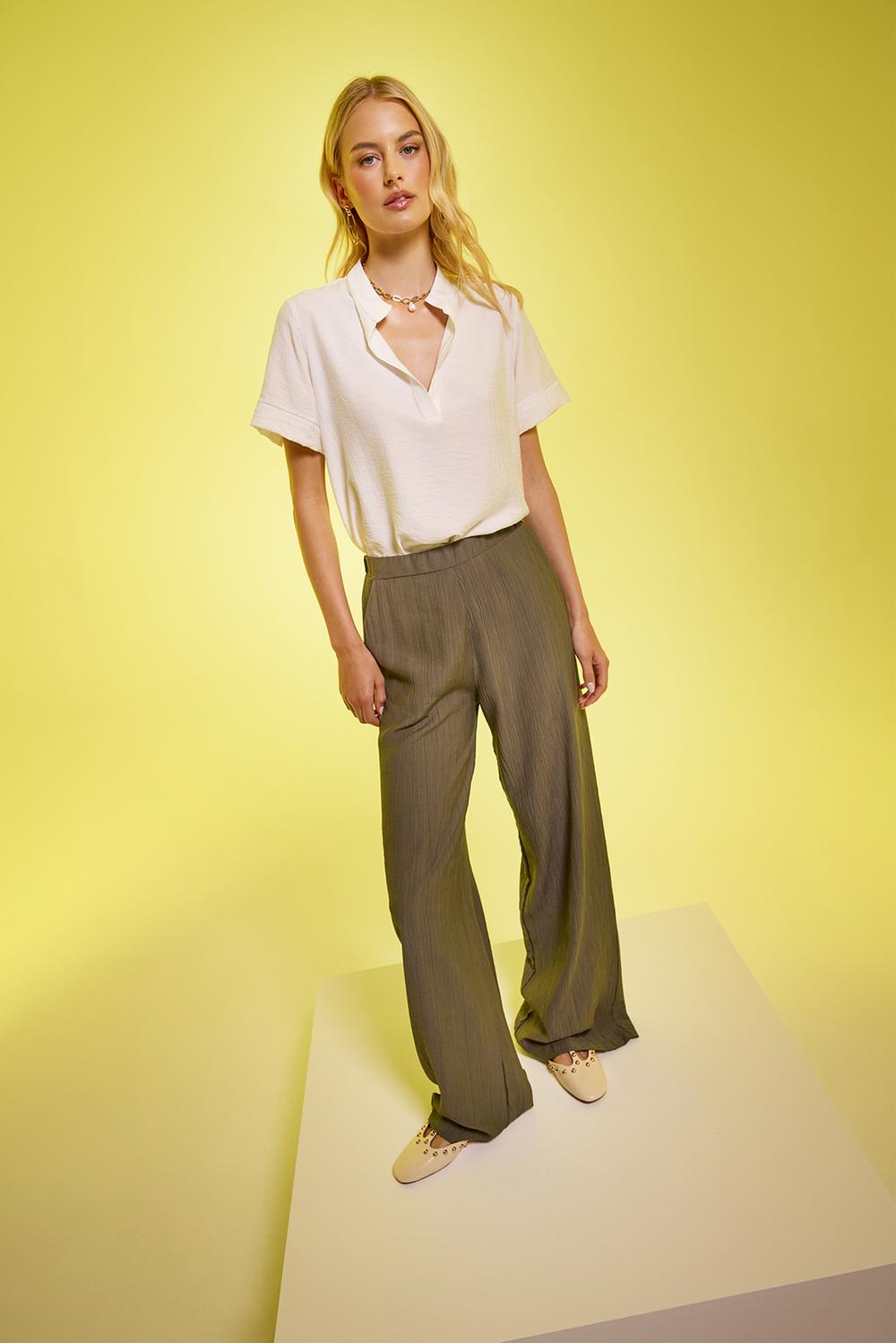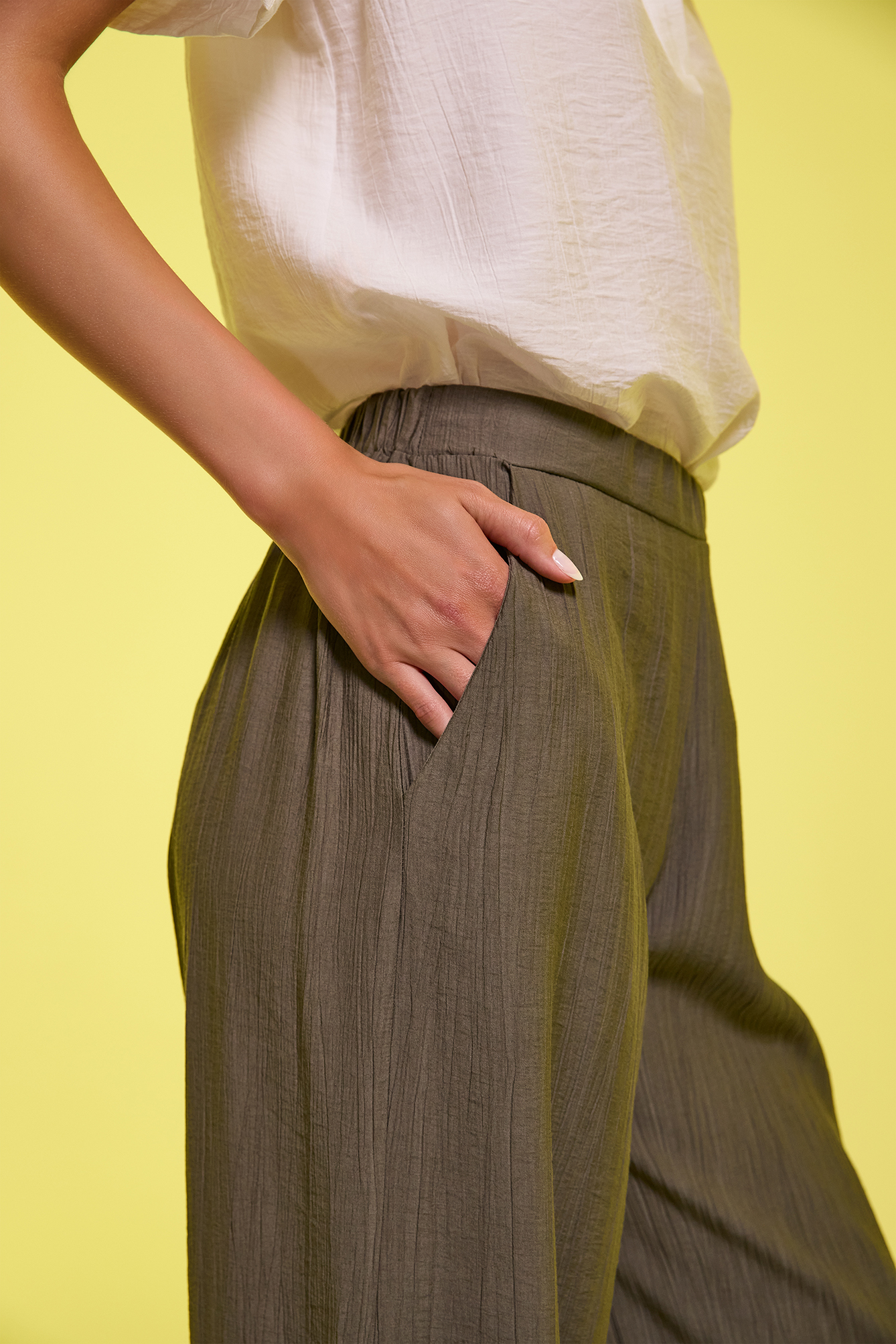 Pants moda con viscosa effetto graffiato. Modello palazzo. Tasche laterali sul fronte. Senza zip. Cinturino elasticizzato.