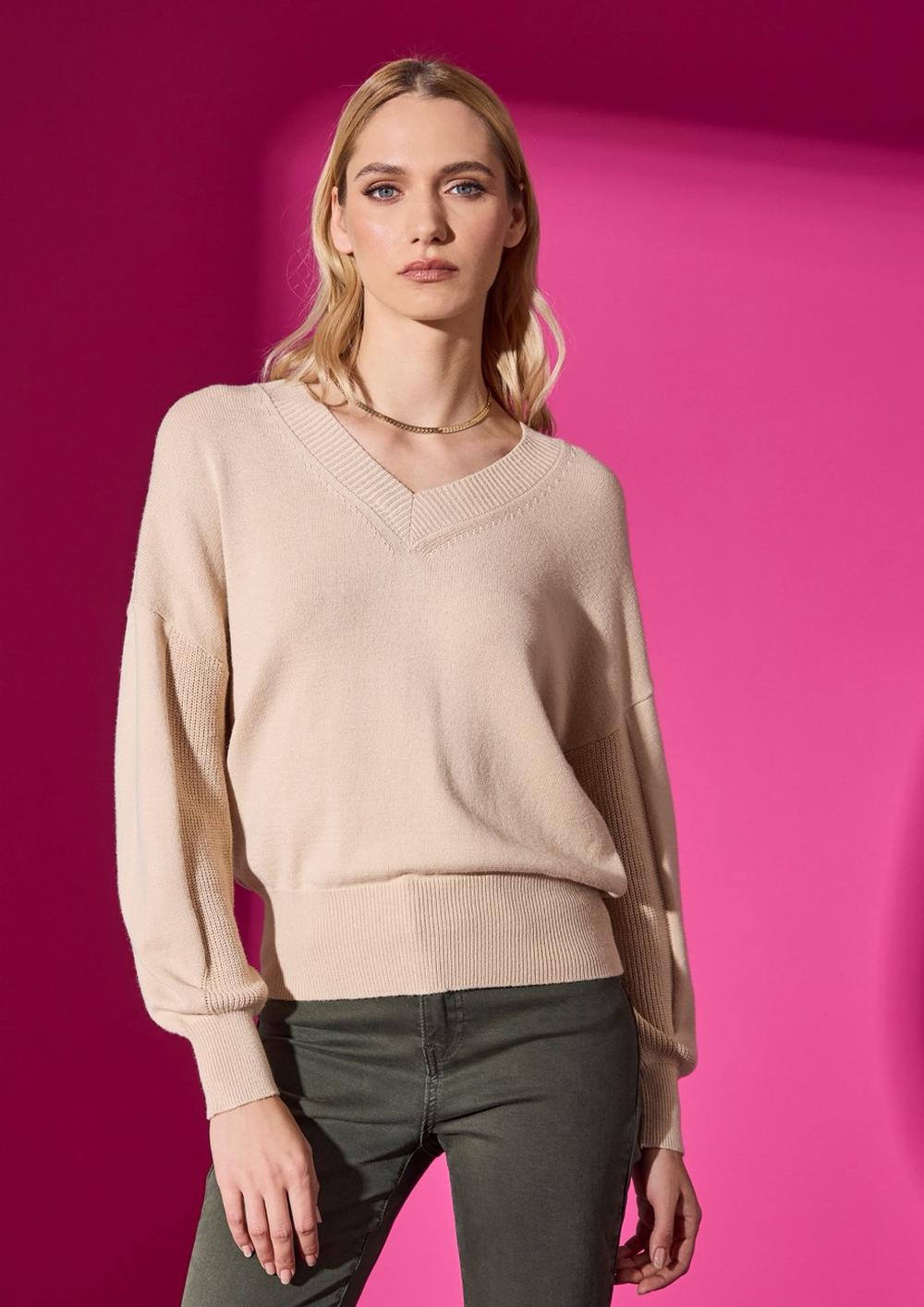 Maglia con viscosa con scollo a V. Manica lunga scesa con dettaglio a maglia inglese. Bordatura di polsi e fondo a microcostina